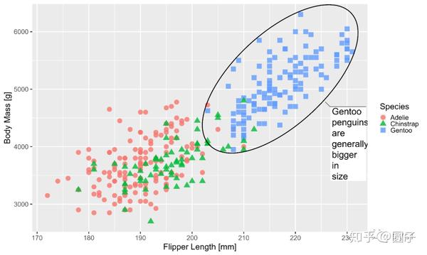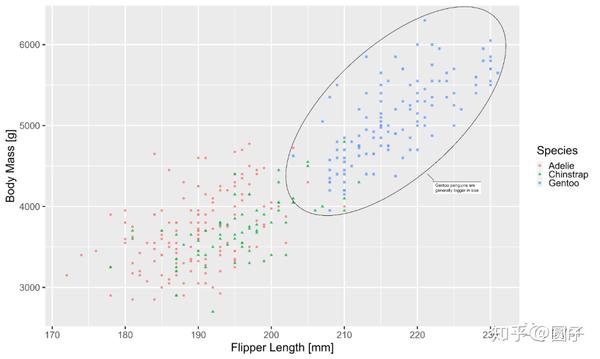 labs(x = "Flipper Length [mm]", y = "Body Mass [g]", colour = "Species",