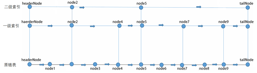 B+树的一种变形,在B+树的基础上将索引层以指针连接起来,使搜索取值更加快捷。如下图(M=3)
