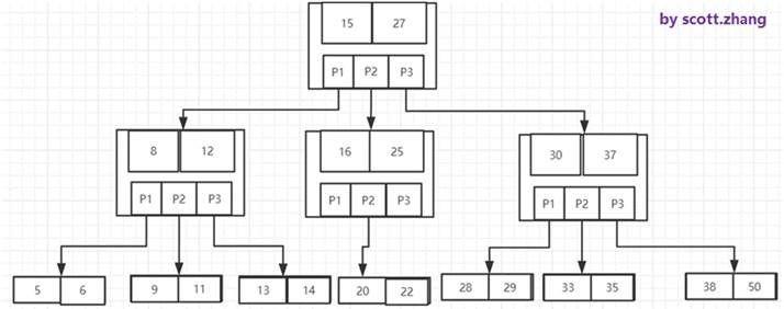 下图是一个M为3的B-树: