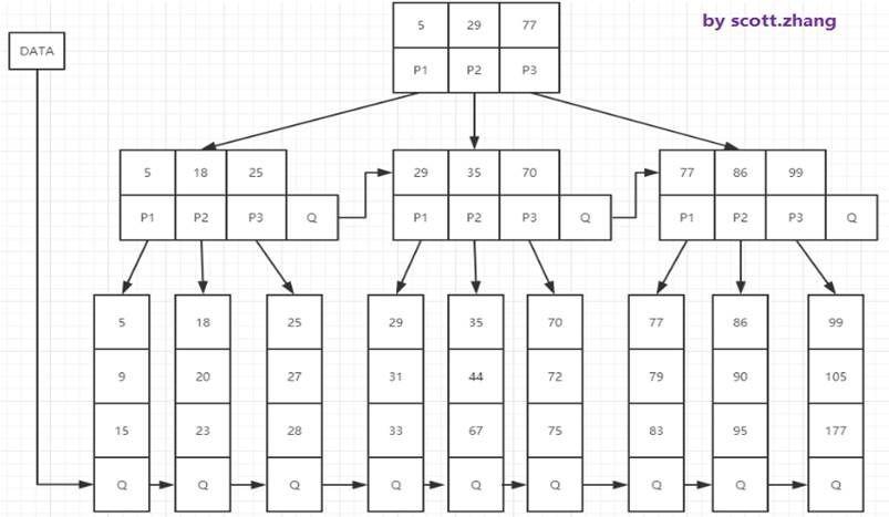 B+树上有两个头指针,一个指向根节点,另一个指向关键字最小的叶子节点,而且所有叶子节点(即数据节点)之间是一种链式环结构。因此可以对B+树进行两种查找运算:一种是对于主键的范围查找和分页查找,另一种是从根节点开始,进行随机查找。