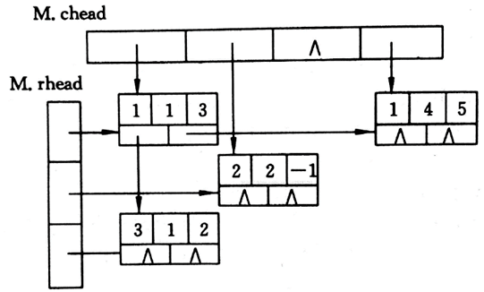 十字链表的结构有五个域,一个数据域存放矩阵元,i、j 域分别存放该非零元所在的行、列。还有right、down域,right指向右边第一个矩阵元的位置,down用来指向下面第一个矩阵元的位置。然后建立两个数组,分别指向每行/列的第一个元素。十字链表在图中也有应用,用来存储图。