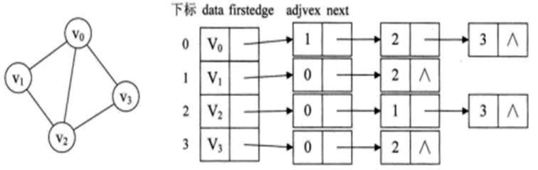 从图中可以看出,顶点表的各个结点由data和firstedge两个域表示,data是数据域,存储顶点的信息,firstedge是指针域,指向边表的第一个结点,即此顶点的第一个邻接点。边表结点由adjvex和next两个域组成。adjvex是邻接点域,存储某顶点的邻接点在顶点表中的下标,next则存储指向边表中下一个结点的指针。