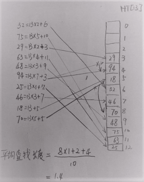 假定一个待散列存储的线性表为(32,75,29,63,48,94,25,46,18,70),散列地址空间为HT[13],采用除留余数法构造散列函数和线性探测法处理冲突。