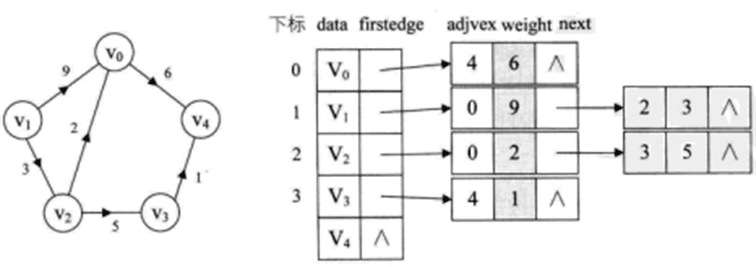 其中firstin表示入边表头指针,指向该顶点的入边表中第一个结点,firstout表示出边表头指针,指向该顶点的出边表中的第一个结点。