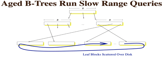 - B+树在查询过程中应该不会慢,但如B+树已运行很长时间,写入了很多数据,随着叶子节点分裂,其对应的块会不再顺序存储而变得分散,可能会导致逻辑上原本连续的数据实际上存放在不同的物理磁盘块位置上,这时执行范围查询也会变成随机读,会导致较高的磁盘IO,效率降低。
