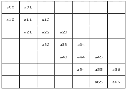 矩阵中所有非0元素集中在主对角线为中心的区域中。下图为3条对角线区域,其他区域的元素都为0。除了第一行和最后一行仅2个非零元素,其余行都是3个非零元素,所以所需的一维空间大小为:3n - 2;