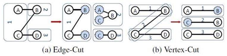 - 边分割 (Edge-Cut):每个顶点都存储一次,但有的边会被打断分到两台机器上。这样做的好处是节省存储空间;坏处是对图进行基于边的计算时,对于一条两个顶点被分到不同机器上的边来说,要跨机器通信传输数据,内网通信流量大。