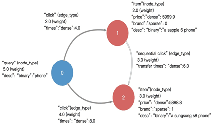 一张有向图的基本元素是顶点和边,一般都具有类型和权重,边是有向的,一条边由:起点、终点、类型三者标识,即相同的两点之间可以同时具有多条不同类型的边。下面是一个简单的带权异构属性图示例:
