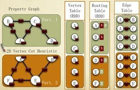 借鉴PowerGraph,使用点分割方式存储图,用三个RDD(Resilient Distributed Dataset,弹性分布式数据集)存储图数据信息: