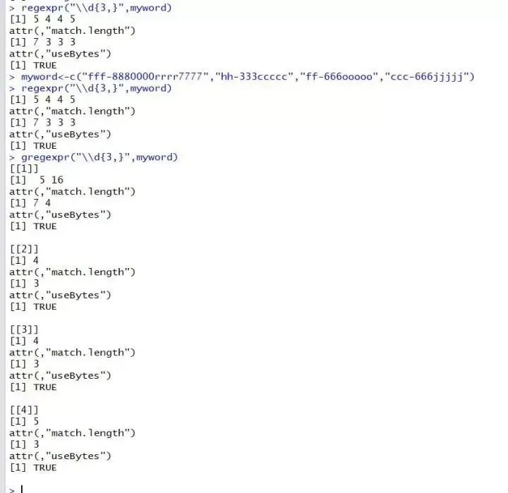 返回值是一个带有属性信息的原子型向量,我们可以看到目标数字在四个记录中的开始位置分别是5,4,4,5,长度分别是7,3,3,3