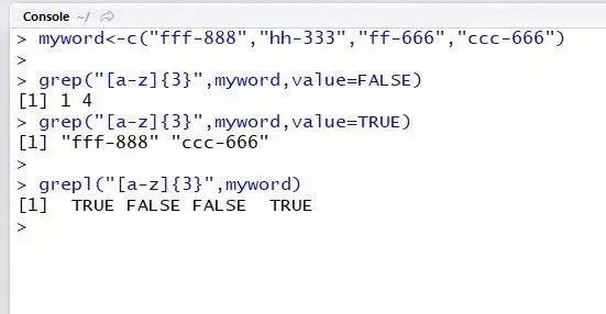 以上需求匹配了含有三个小写英文字母的记录,分别返回了序号、记录、布尔值,这三种方法都可以作为进一步筛选,进行行索引的合法输入条件。