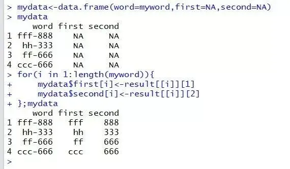 mydata<-data.frame(word=myword,first=NA,second=NA)