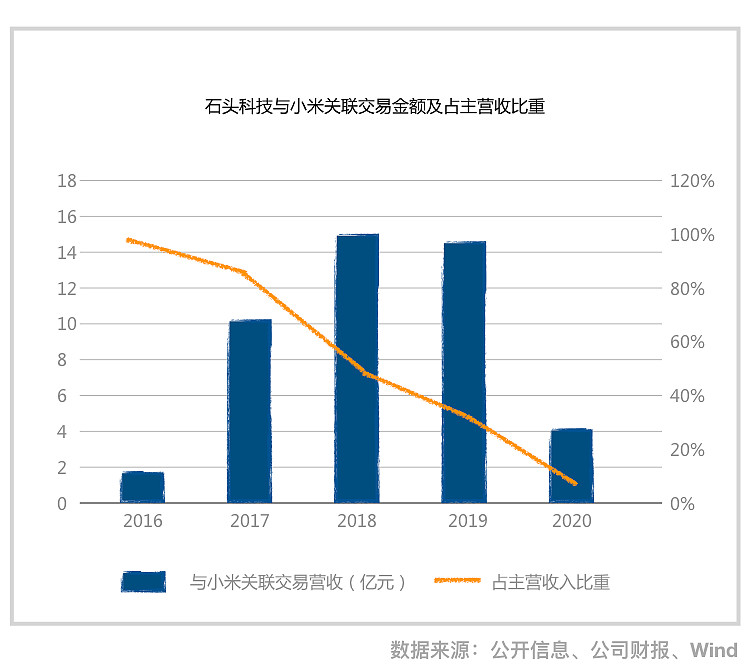 石头科技 的主营业务为智能清洁机器人等智能硬件的设计、研发、生产和销售,2017年起,石头科技陆续推出“石头智能扫地机器人”和“小瓦智能扫地机器人”,自有品牌业务的持续拓展,让石头科技对小米的依赖度降低。 石头科技与小米关联交易金额占主营业务收入的比重,从2016年的100%下降至2020年的9.28%;关联交易金额也从2018年的峰值15.29亿元,回落至2020年的4.20亿元。 至此,石头科技可谓突围成功。小米的另一家生态链企业华米,在上市之后,也对外界持续释放“去小米化”的信号,华米的举动频频成为舆论热议的焦点。
