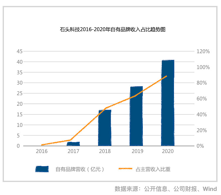 究其原因 ,因为毛利率较高的自有品牌业务及海外销售的占比提升, 石头科技 利润增速大幅高于营收增速。据财报显示,石头科技2018-2020年的毛利率分别为28.79%、36.12%和51.32%;自有品牌产品销售额占比由2019年的65.73%增长至2020年的90.72%,相比2019年增长了24.99%;境外业务在2020年实现营收18.68亿元,同比增长221.33%,占总收入比例的41.2%,而境外业务的毛利率为58.29%,也大幅高于境内业务的46.43%。