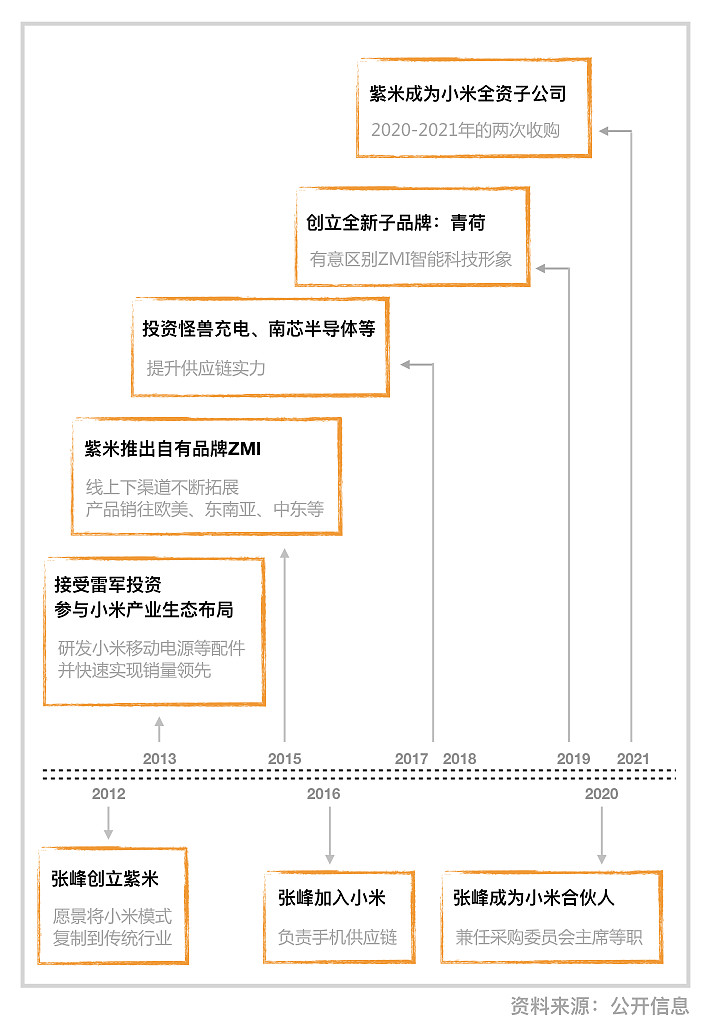 紫米与小米的另外一层渊源,来自公司创始人层面。紫米的创始人张峰在2016年加入小米,负责手机供应链业务。张峰毕业于上海科技大学无线电电子测量专业,从事手机及通讯行业20余年。1993年-2012年,张峰任英华达总经理,促成了英华达与小米的合作,使英华达成为小米手机最早的代工厂。此后,张峰创办紫米电子,成为小米生态链企业。2020年,张峰成为小米的合伙人、参谋长,并兼任集团采购委员会主席、小米笔记本总经理,被列入小米下一个十年的“联合创始人”梯队。 这种渊源的深度,是小米供应链生态其他公司所不具备的特点。