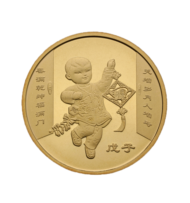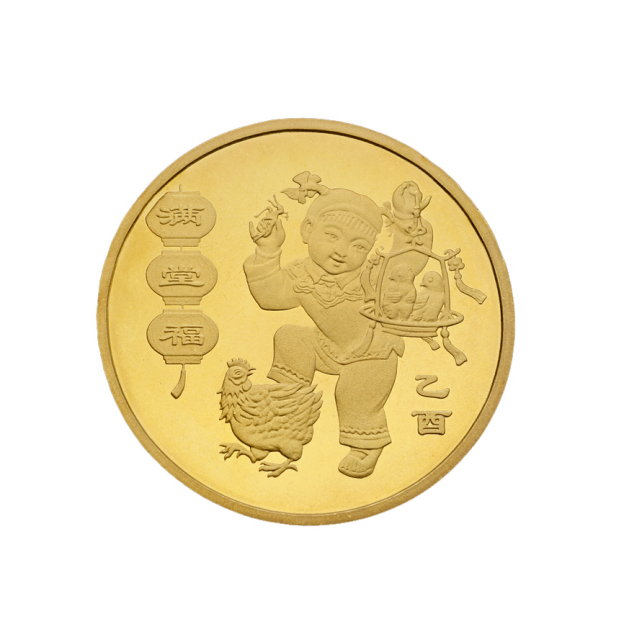 2005年的鸡年生肖纪念币,图案为身穿中国传统服饰的儿童,左手提着装有两只雏鸡的篮子,右手牵着一只蚂蚱,其下方为一只母鸡。左侧为书有“满堂福”的迎春灯笼。发行量1000万,当前市场参考价49元。