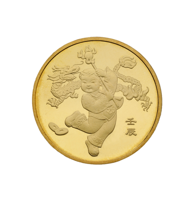2012年的龙年生肖纪念币,图案为一个着中国传统服饰的小男孩在舞龙。发行量8000万,当前市场参考价8元。