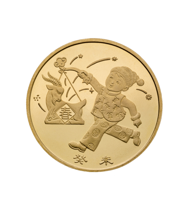 2003年的羊年生肖纪念币,图案为身穿中国传统服饰的儿童,手持悬挂在如意上的羊形迎春灯笼。发行量1000万,当前市场参考价153元。