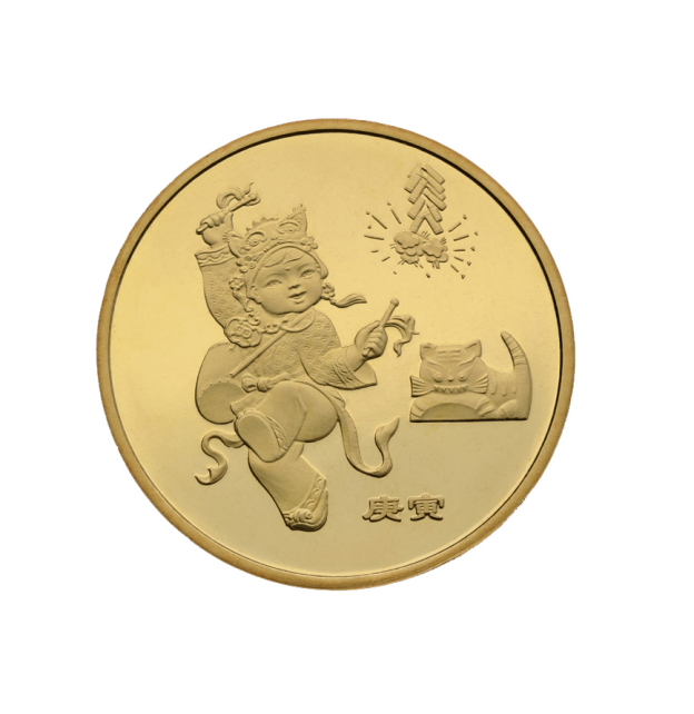 2010年的虎年生肖纪念币,图案为一个戴着虎头帽的儿童敲打腰鼓,背景为燃放的鞭炮和布老虎图案。发行量3000万,当前市场参考价10元。