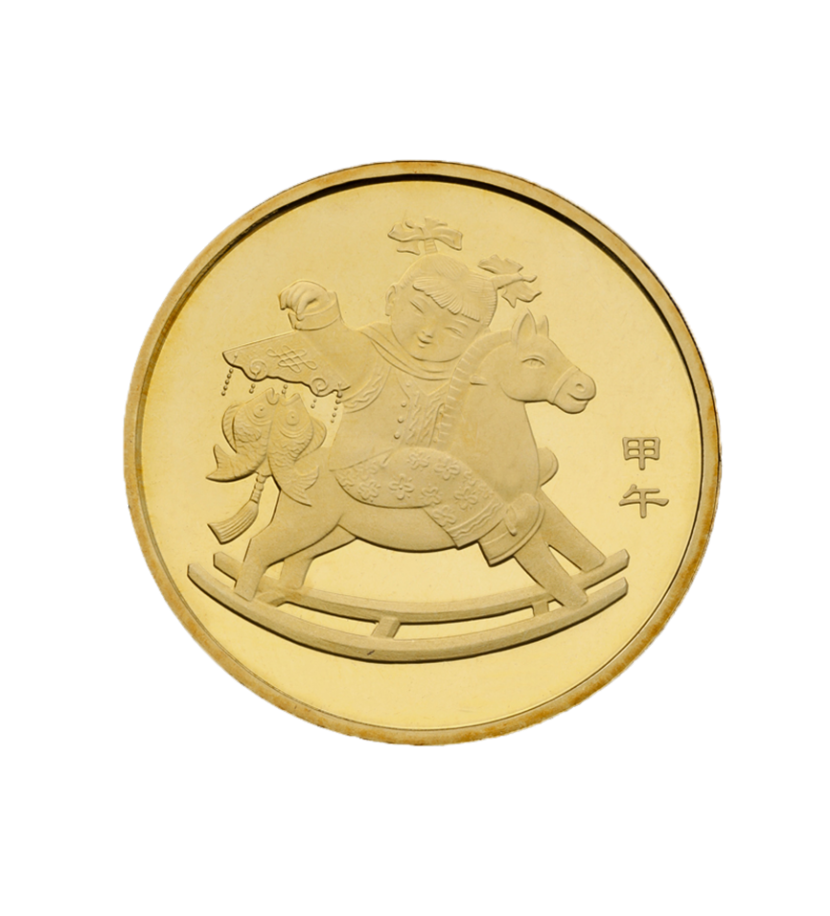 2014年的马年生肖纪念币,图案为一个手持寓意“吉庆有余”挂件的小女孩骑在木马上。发行量1亿,当前市场参考价5元。