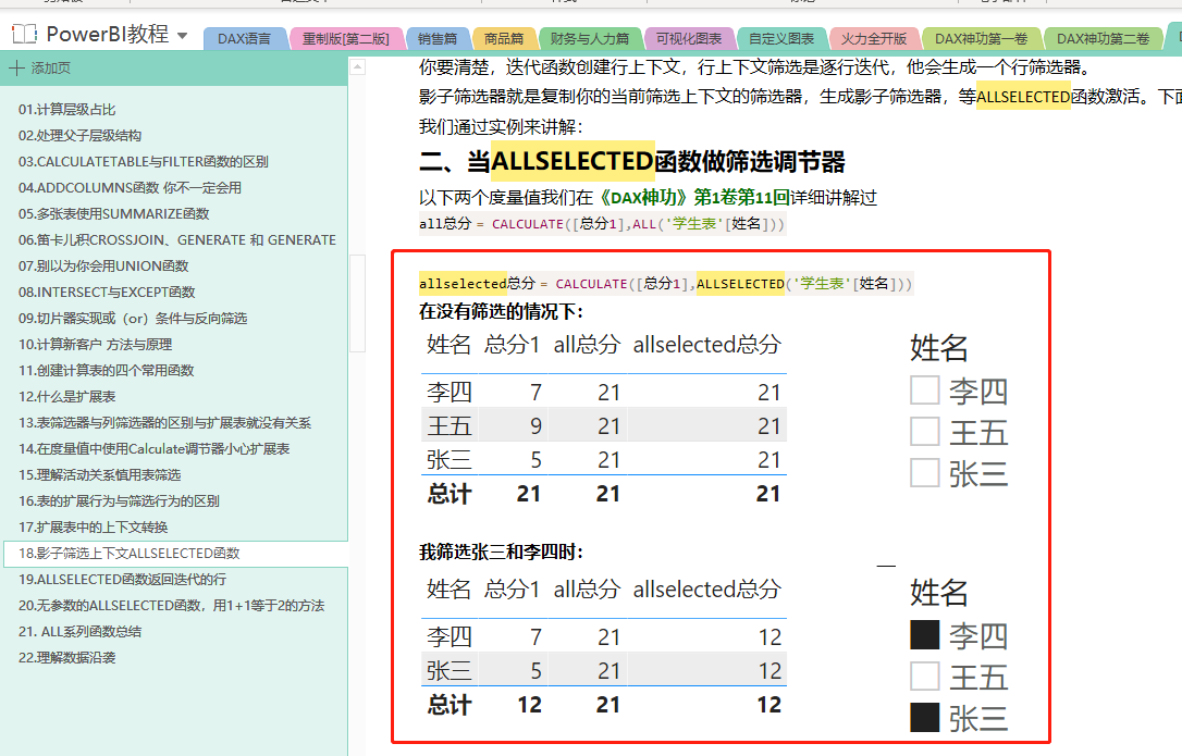为什么会发生这样的情况,因为度量值本身可以筛选,我们现在要获取的是切片器的最小值和最大值,不能让内部筛选影响我们。《DAX神功》第1卷第11回和第3卷第18回,我们讲到一个函数,它可以删除内部筛选,但是保留外部筛选,它就是Allselected函数