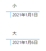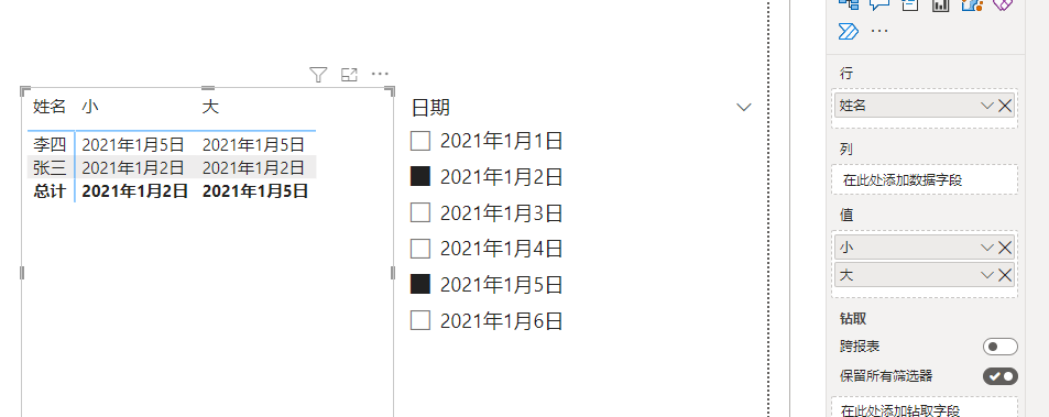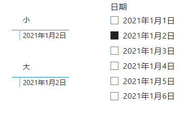 当切片器只选择2021年1月2日时,表示我只筛选了2021年1月2日的数据,所以度量值小和大都显示2021年1月2日