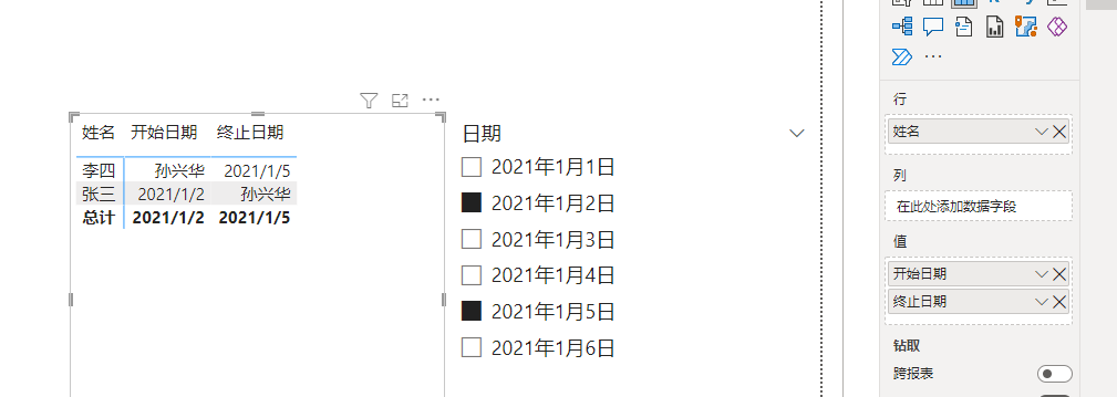 当我在切片器上选择2个或以上日期时,就代表我选择的日期是从切片器上我选择日期的最小值到我选择日期的最大值的区间数据。所以最小是1月2日,最大是1月5日