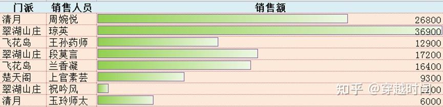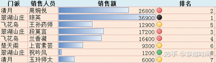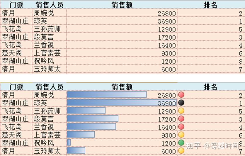我们可以先来看看下面这张对比图片,图片的上半部分就是连载11中的结果,无论是销售额还是排名,都只是数字,整个表格显得光秃秃空荡荡的;图片的下半部分则在单元格中加入了代表数据大小的长条、代表名次高低的彩色圆点,瞬间就有了高端大气上档次的感觉,这是怎么实现的呢?