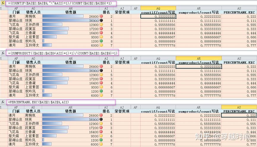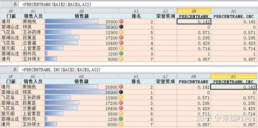 上图中可以看到依据这种规则计算出来的结果,举个例子,“琼英”的销售额最高,排名为1,那么她的百分比排位就是前0%,“周婉悦”的排名为2,那么她的百分比排位就是前14.2%