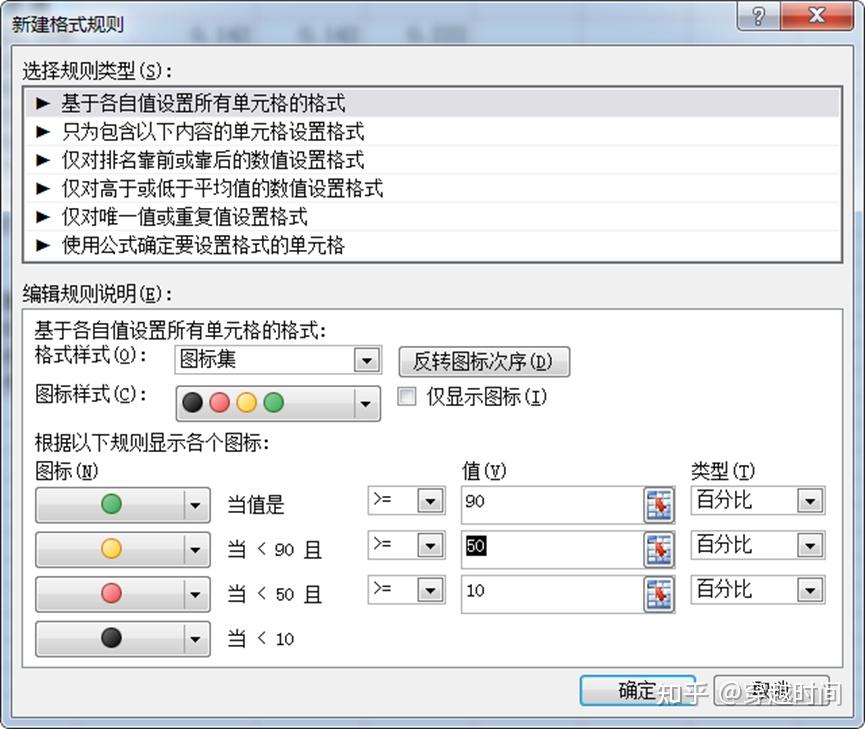 然后在下方调整规则,输入我们定义的分隔数值90%、50%、10%,然后确定。