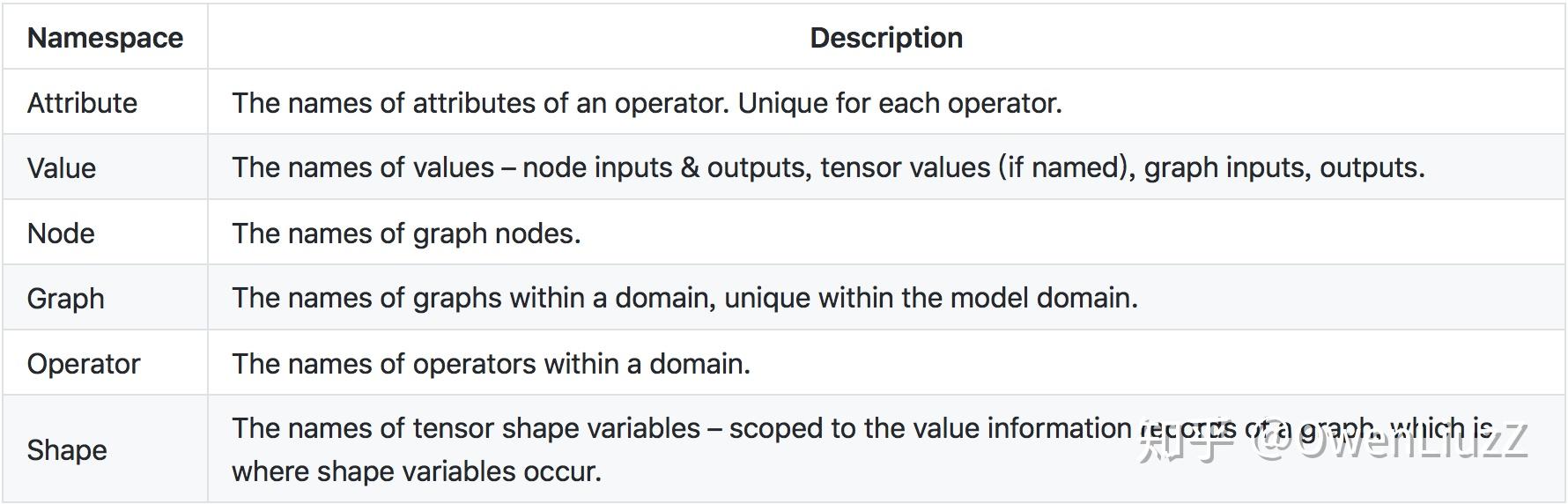 节点,输入,输出,初始化器和属性的名称被组织到多个名称空间中。 在命名空间内,每个给定图形的每个名称必须是唯一的。