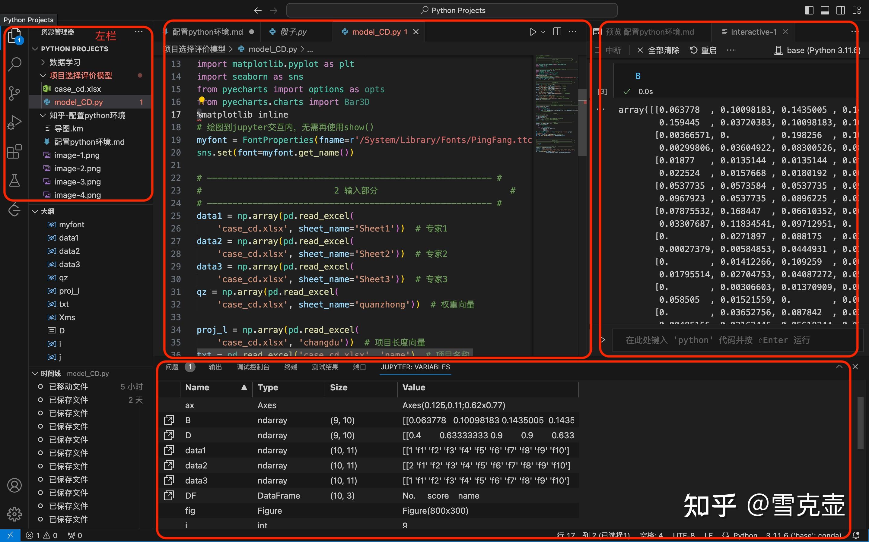 - 终端、调试区:调控台、终端,安装Jupyter插件后可查看数据分析变量。
