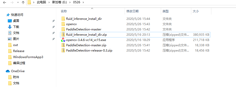 一、首先将上述需要依赖的opencv和预测库,PaddleDetection下载好,并保存在某个文件夹中。如下图是作者存放的一个文件夹。