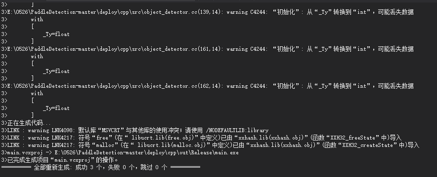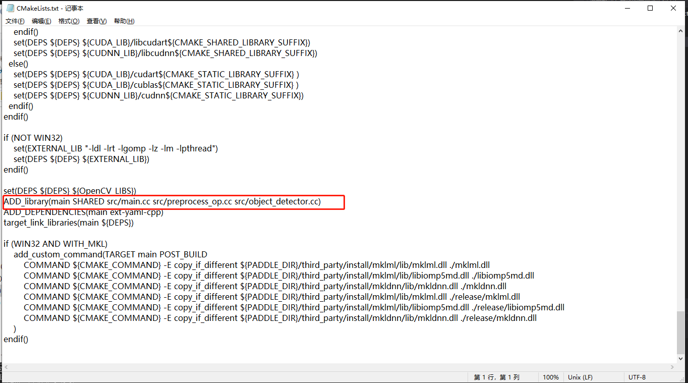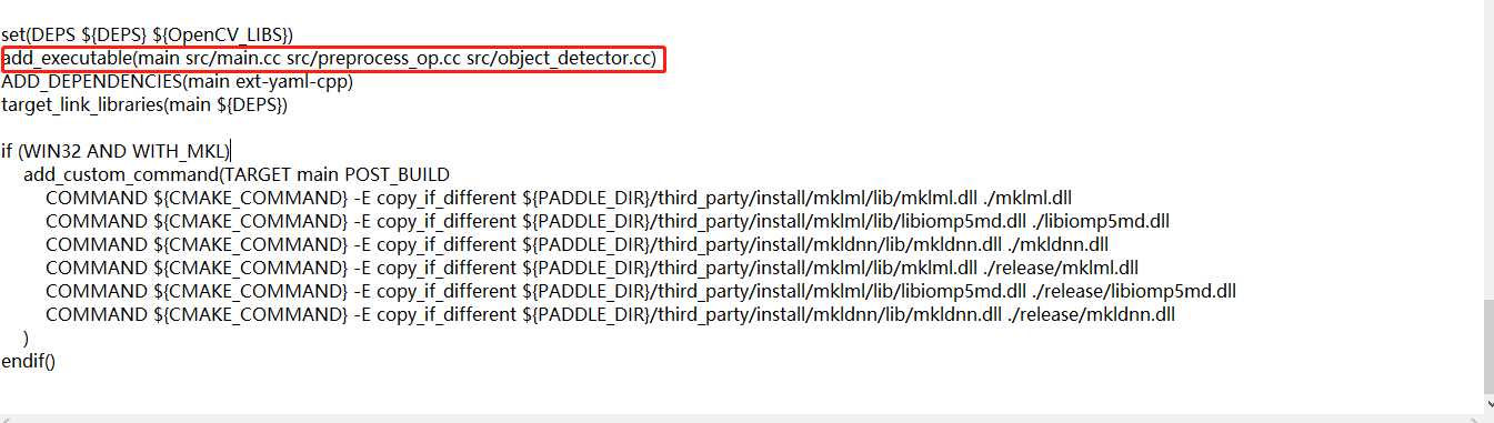 将add_executable(main src/ http:// main.cc src/ http:// preprocess_op.cc src/ http:// object_detector.cc ) 变成ADD_library(main SHARED src/ http:// main.cc src/ http:// preprocess_op.cc src/ http:// object_detector.cc )