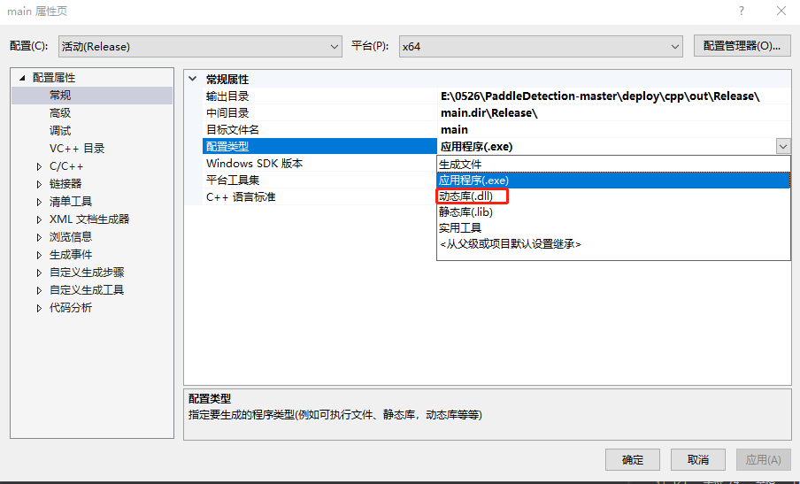- 再次经历之前的cudnn的路径问题,同时需要在属性—常规—配置类型中修改成.dll文件。
