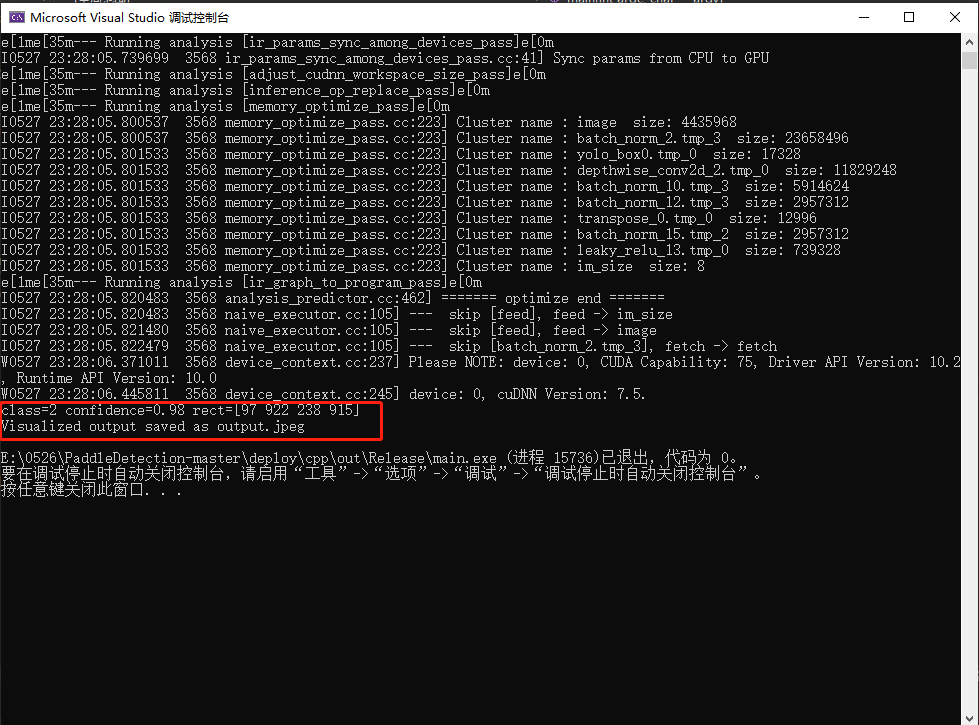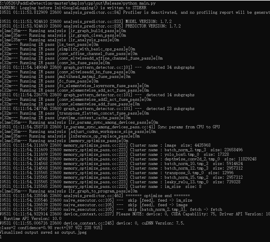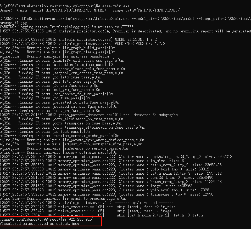 十二、运行该生成的main.exe文件。方式为打开out/release文件,会发现有一个main.exe文件。利用命令行打开后,运行即可。运行过程中需要添加模型的路径以及预测图像的路径。