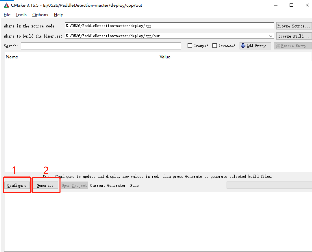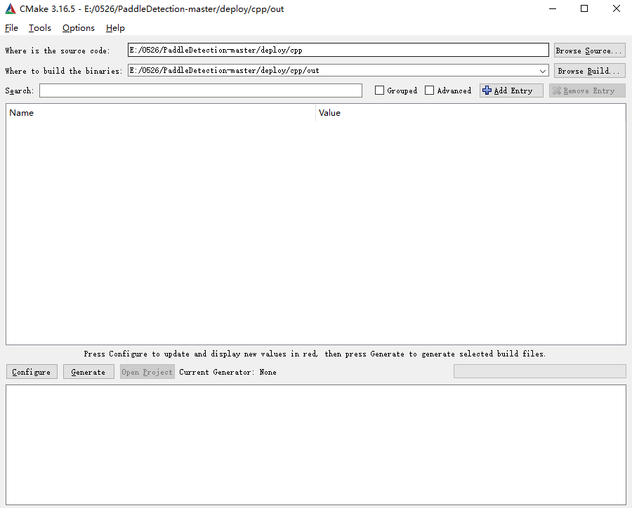 三、利用Cmake软件进行编译。源码路径为cpp文件所在目录,应为里面有CMakeLists.txt文件,作者同时在该目录下创建了新的文件夹/out用于生成编译后的文件。