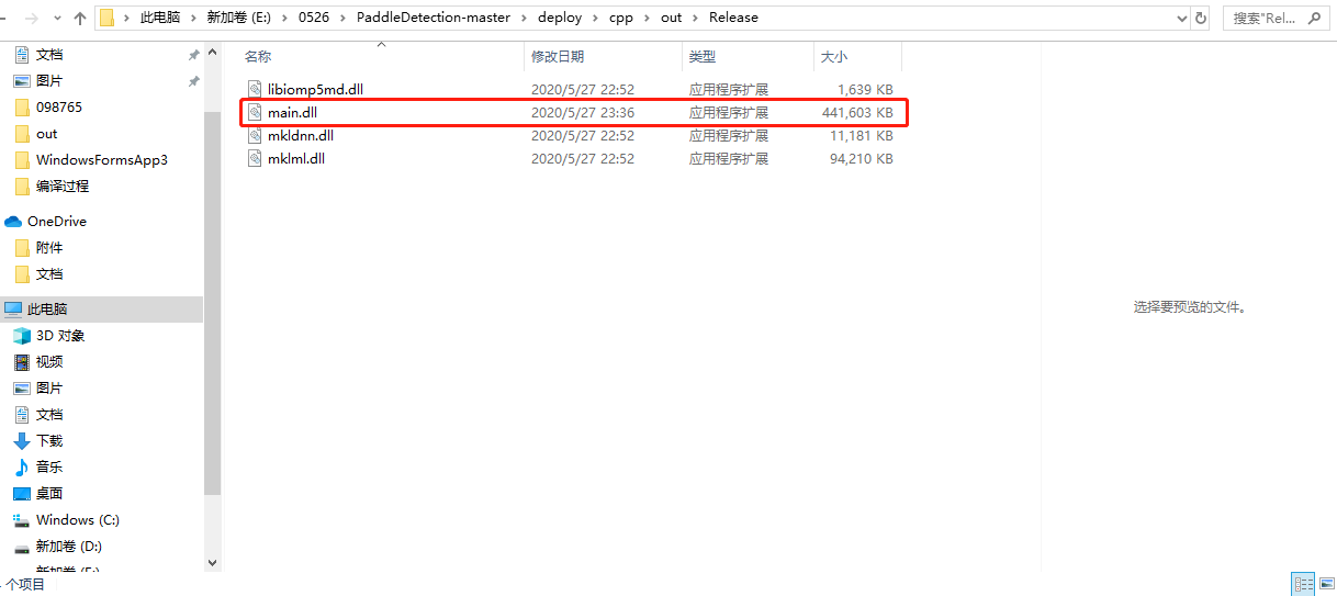 - 修改完上述内容后,点击“重新生成”,会发现out/release中出现了main.dll文件。
