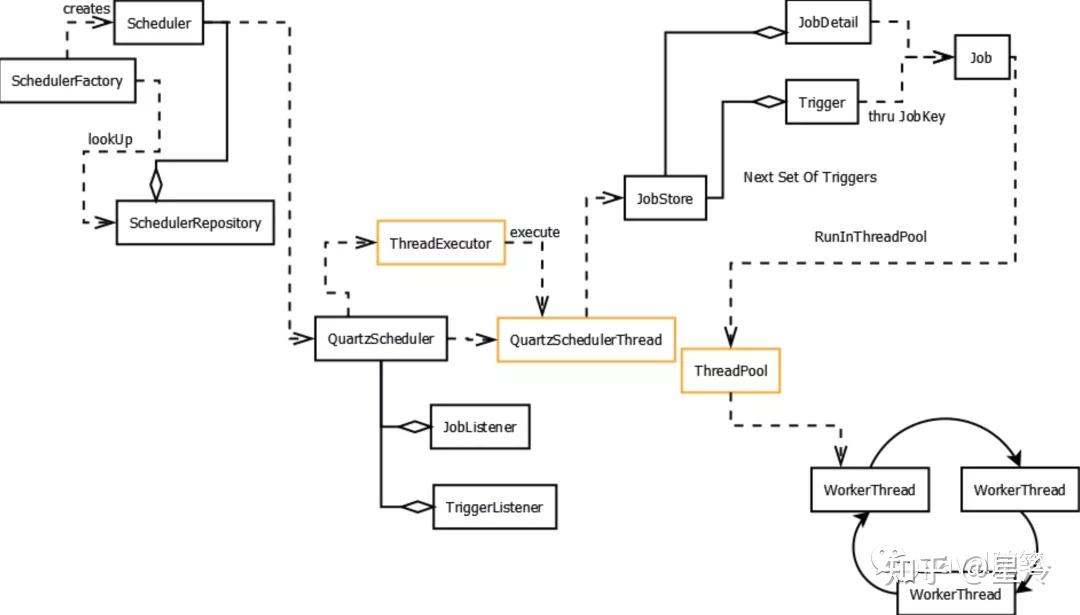 - Scheduler,定时任务的调度器(组装器);Quartz通过调度器来注册、暂停、删除Trigger和JobDetail。