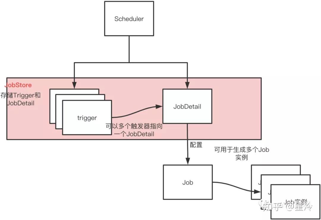 - JobDetail,定时任务中的“任务”;Job接口是真正需要执行的任务。JobDetail接口相当于将Job接口包装了一下,Trigger和Scheduler实际用到的都是JobDetail。