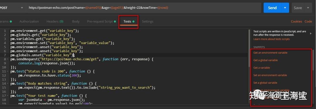 在 postman 中封装了我们常见的断言(Tests),当然 Tests 除了可以作为断言,还可以当做后置处理器,经常应用于: