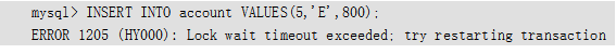 此时客户端B中的添加操作卡住不动,这是因为客户端A的事务隔离级别为SERIALIZABLE(可串行化),客户端A中的事务还没有提交,所以客户端B必须等待客户端A中的事务提交后才可以进行添加数据的操作。当客户端A长时间没有提交事务时,客户端B会报错。