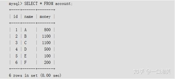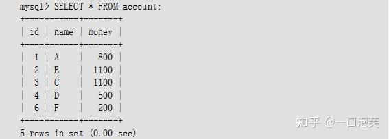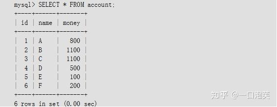 以上执行结果证明客户端A的隔离级别设置为READ UNCOMMITTED(读未提交)。在客户端A中查询account表中的数据。