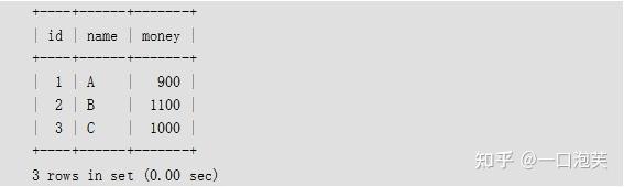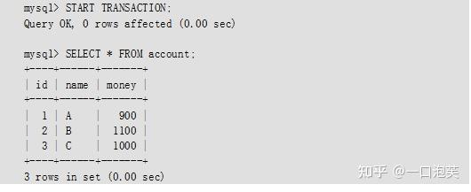 从以上执行结果可以看出,事务开启后账户A减去了100元。然后查看表中数据。