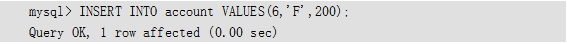 以上执行结果证明数据插入完成。然后在数据库DB2中向account表插入账户F,余额为200元。