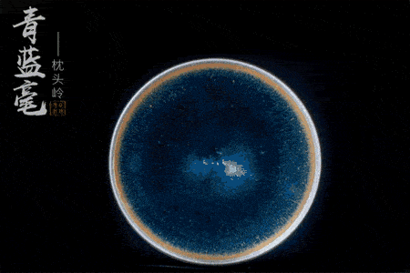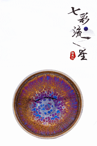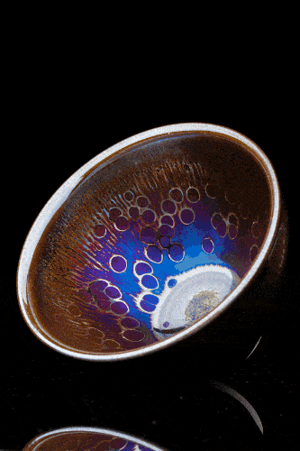 ▲代表作品《七彩流星油滴曜变盏》外形端庄,盏内外壁黑釉上散布浓淡不一、大小不等的琉璃色斑点,入水灯照之下,釉斑会折射出晕状光斑,美轮美奂,似真似幻,令人生惊艳之叹。