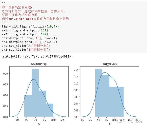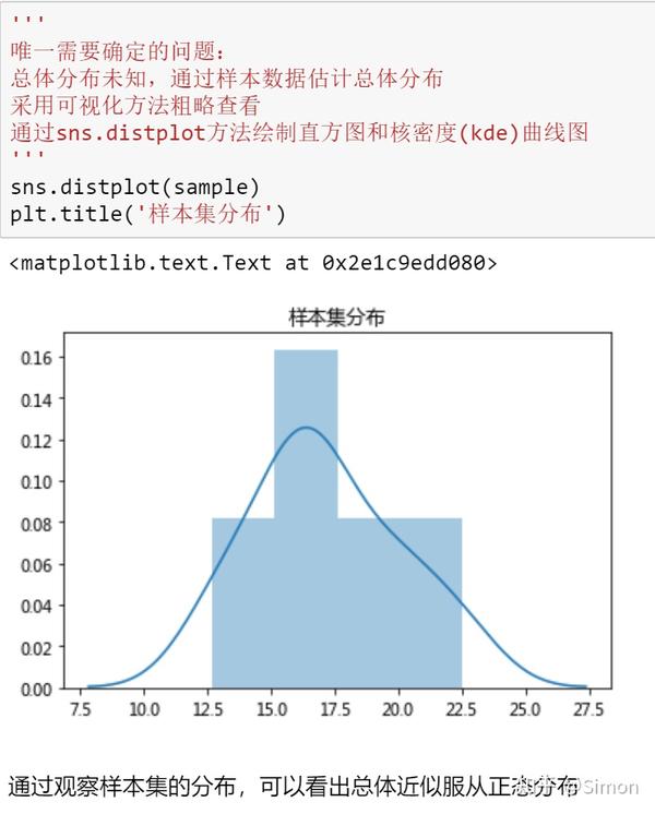 小样本的抽样分布是否满足t分布使用条件(总体近似正态)?因总体未知,此处只能通过样本数据的可视化分布,大致推断总体是否服从单峰的正态分布。