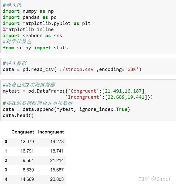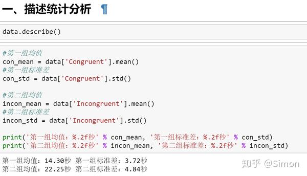 通过网上的stroop实验做测试人的反应时间 斯特鲁普效应 ,每名参与者得到两组有颜色的文字,第一组数据是字体内容和字体颜色一致,第二组数据是字体内容和字体颜色不一致。每名参与者对每组文字说出文字的颜色,并分别统计完成每组的时间。