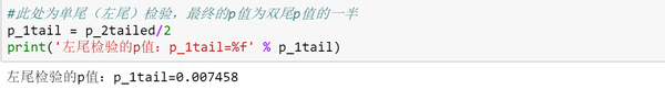 由于该例属于单尾检验,所以最终的p值需要双尾p值除以2: