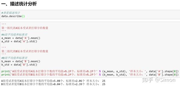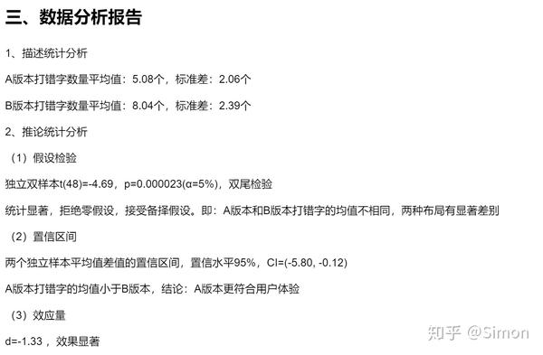 通过读取置信区间的数值,区间边界值均为负值,证明A版本打错字数量均值显著小于B版本,即A布局版本更符合用户体验。